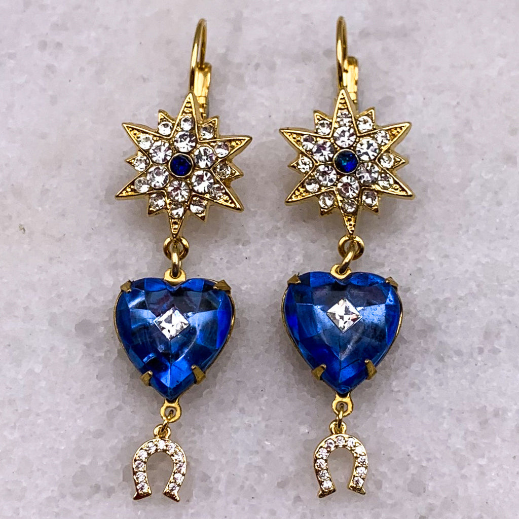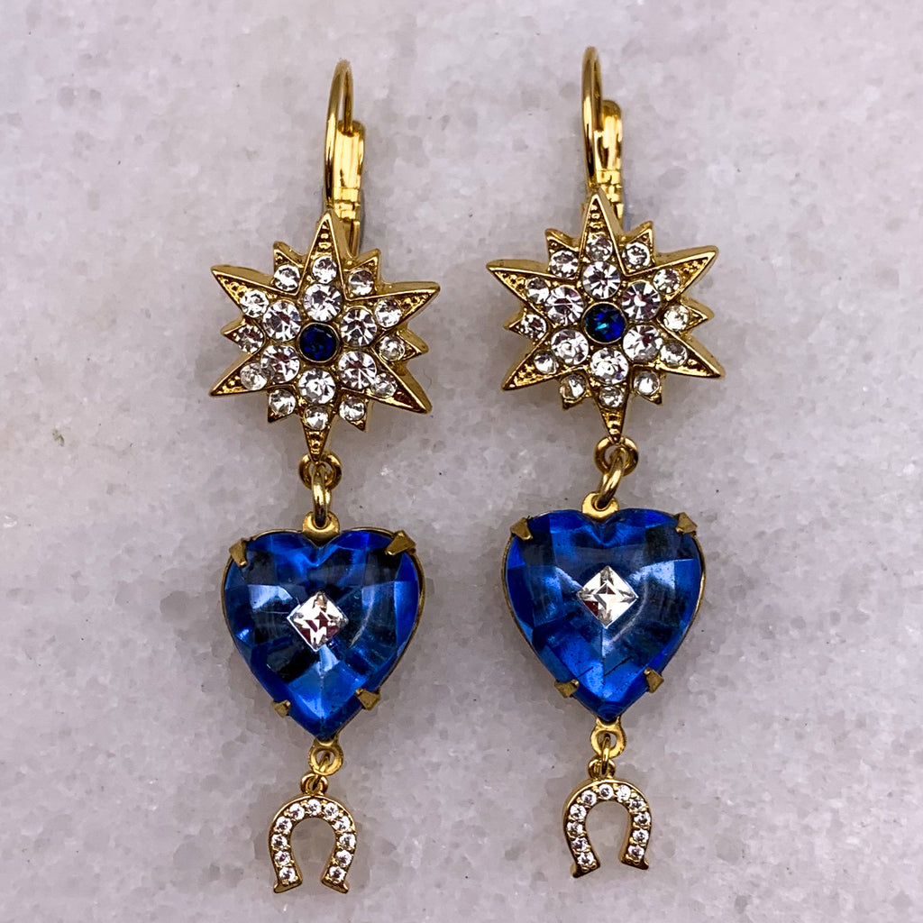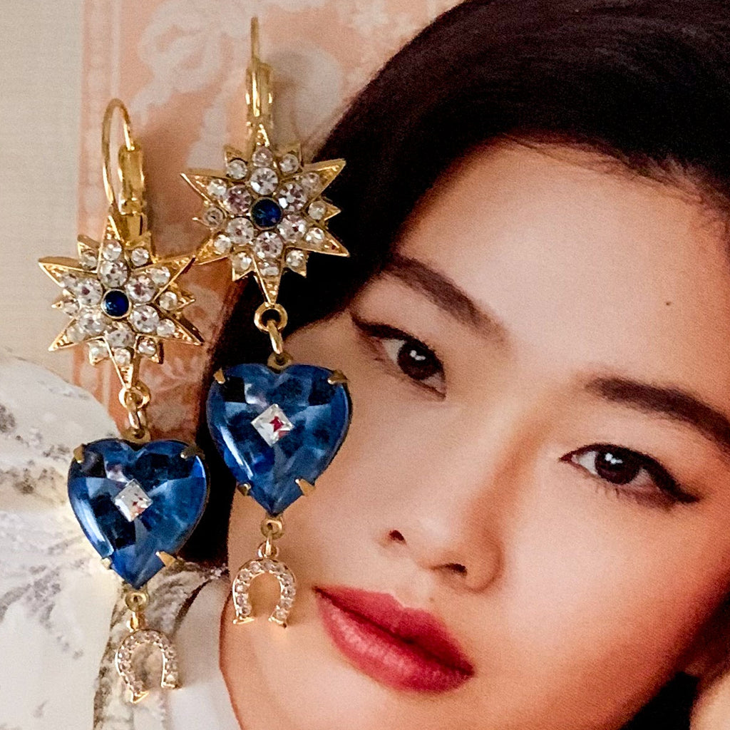 Rare 1940’s Vintage Sapphire Blue Hearts with centre Kite diamond crystal. Fabulous Star crystal hoop gold filled earpost and tiny lucky crystal gold filled horseshoe drop.