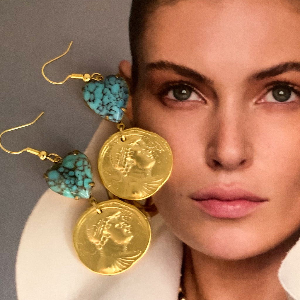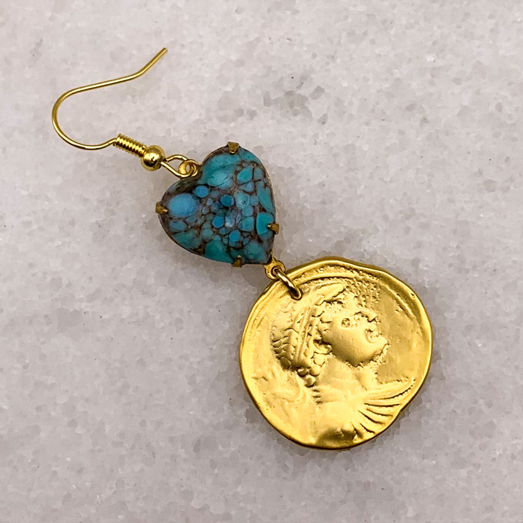 Such beautiful Earrings, with these gorgeous 18 Carat Gold Filled Vintage Coins and Wonderful Turquoise Matrix Hearts.