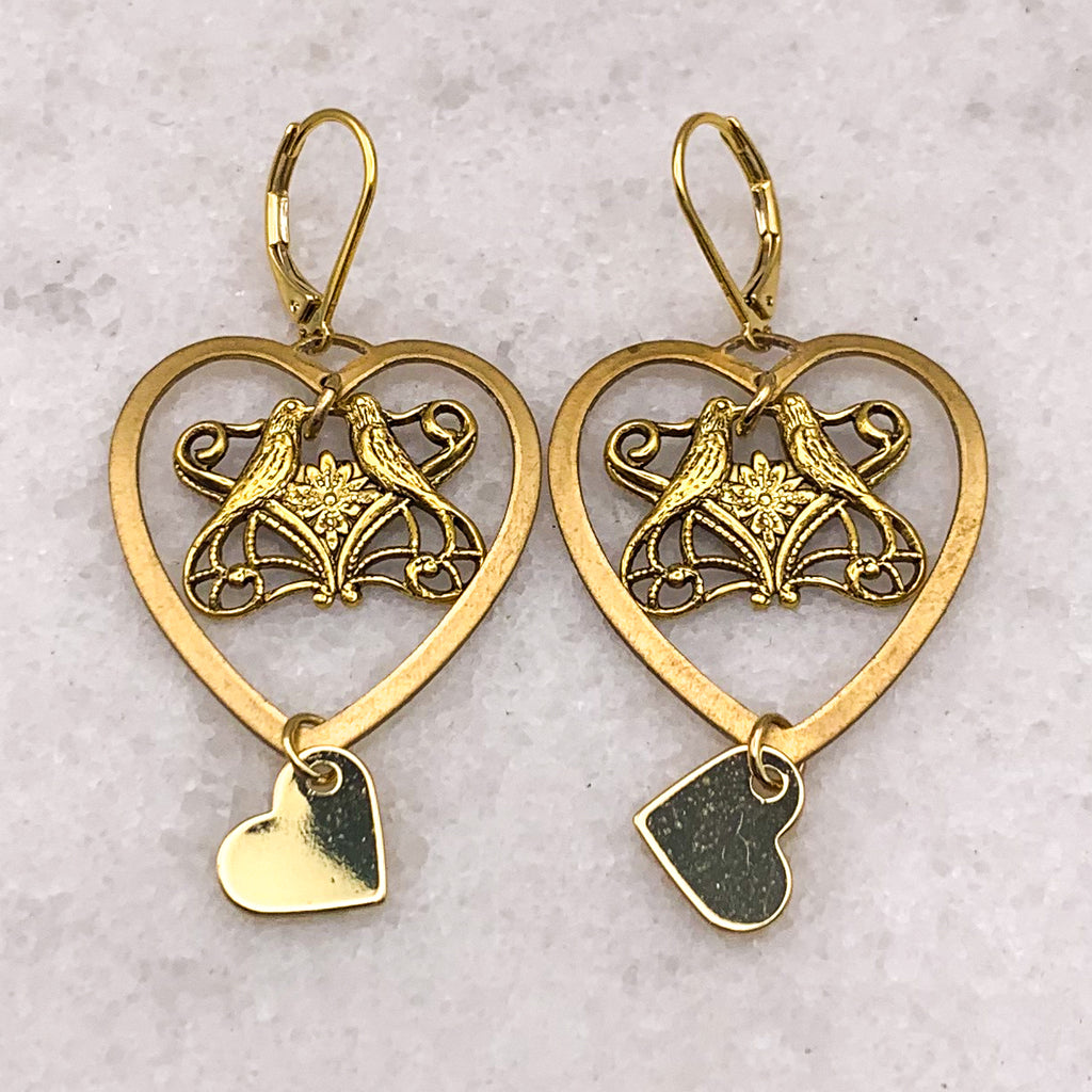 Beautiful Earrings made from Exquisite Vintage Art Nouveau Gold-Filled Lovebirds immersed in a golden heart with heart charms.