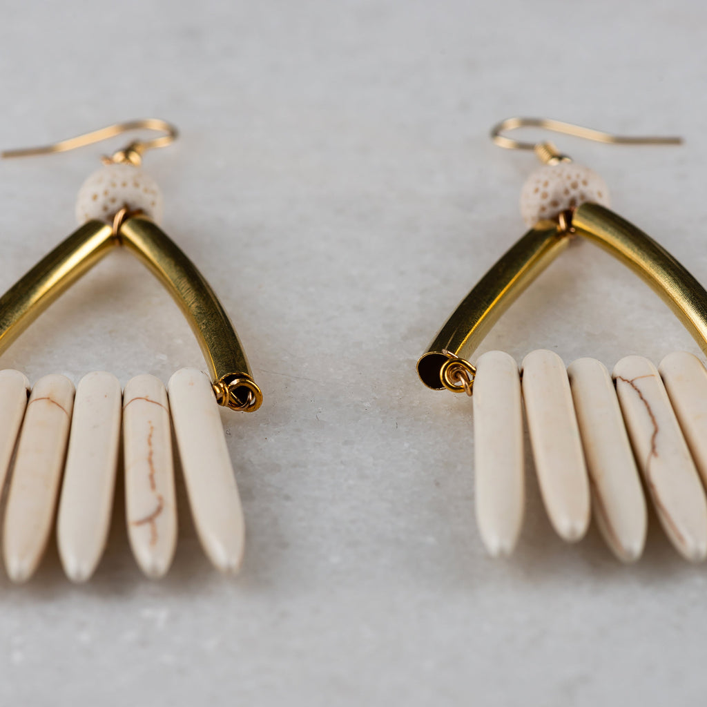 Set with Natural Howlite Spikes, Vintage Brass, Bleached and Carved Lava topped off with the faintest shimmer of pink vintage Swarovski crystal and 18 carat gold plated earwires.