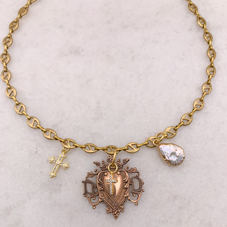An Ornate Necklace, Golden Vintage French Heart featuring the Emblems ND, for Notre Dame, hung with a Wonderful 24 Carat Gold Dipped Natural Fresh Water Pearl, Crystal 16 carat gold cross on an Exceptionally Rare Vintage Gucci Chain.