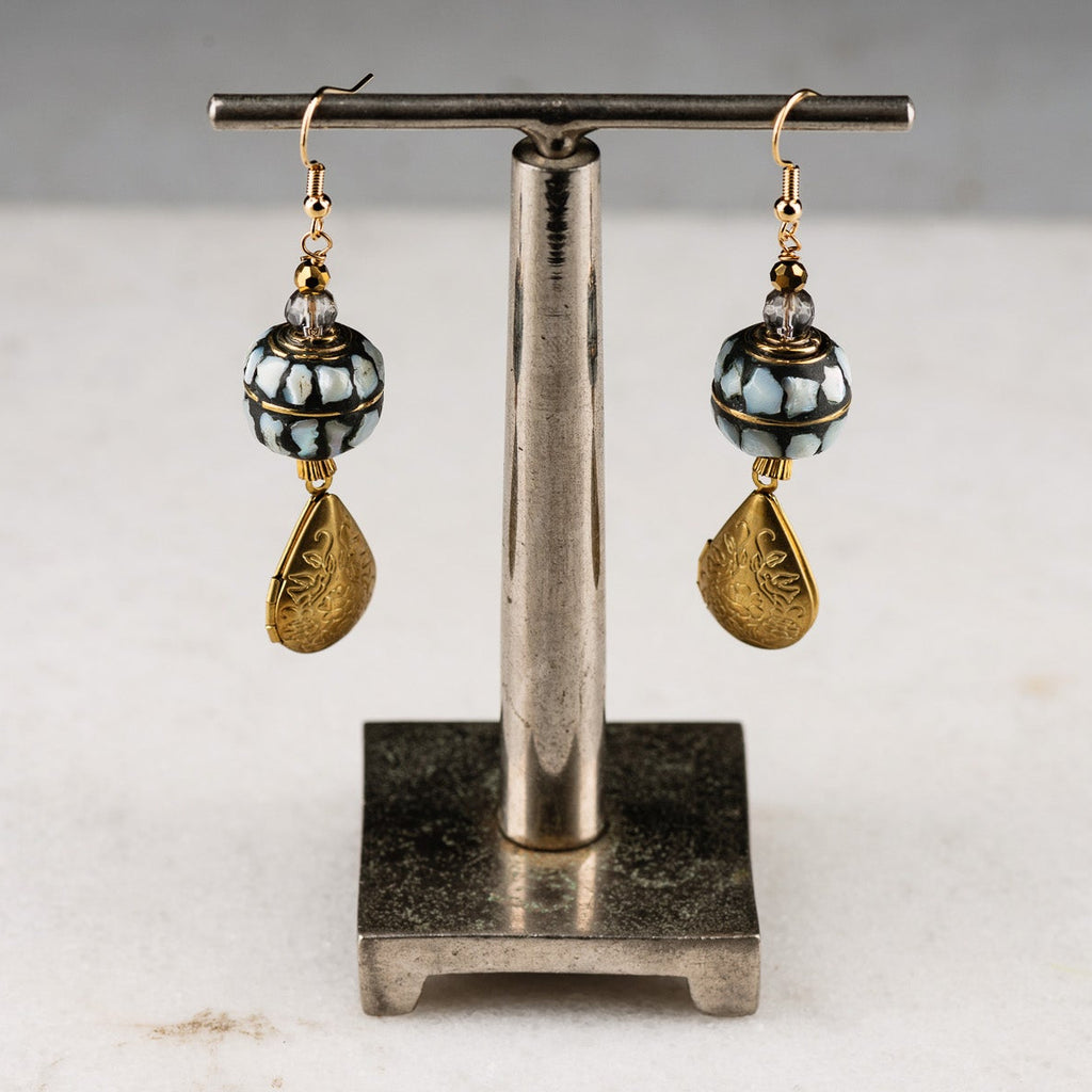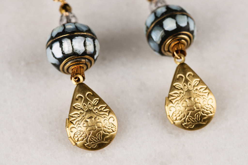 We found these beautiful Vintage Tibetan beads with Mother of Pearl mosaic and golden brass and hung with these wonderful etched front vintage tear drop Lockets and 18 carat gold plate ear post.
