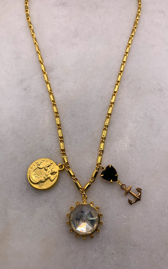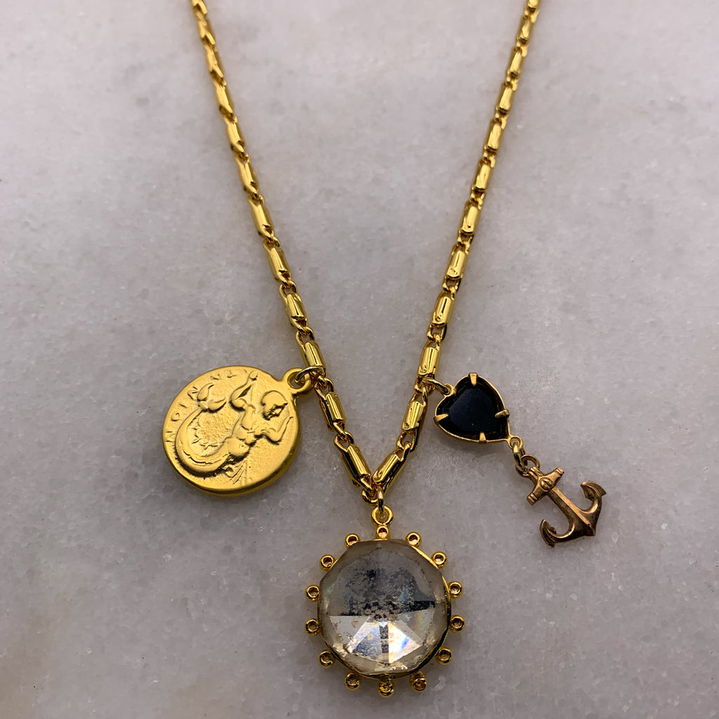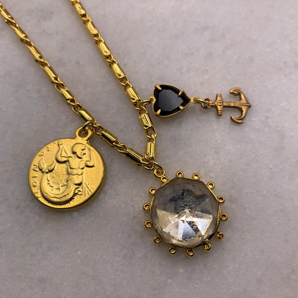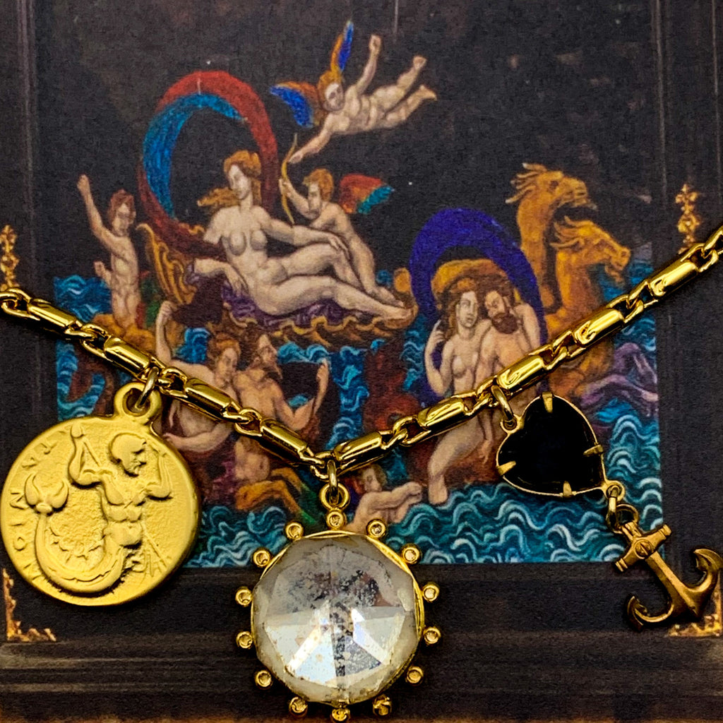 Mermen and Sea Creatures are Carved into the Wonderful 18 Carat Gold Filled Coin Medallion. The Heart and the Anchor Charms reflect Love and Hope and are added as Talismans or Amulets to bless the wearers with both Love and Hope.
