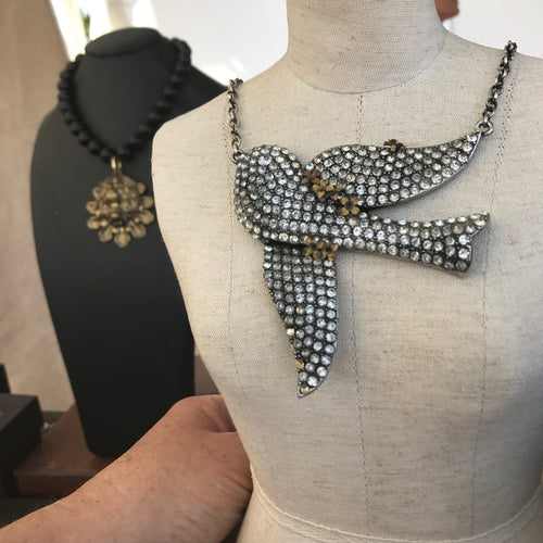 Sculptor, Wendy Powitt, draws from her collection of rare vintage crystal & glass stones, dark brooding cameos, decorative chain, lucite, plastic and stainless steel to create lush and elaborate conceptual pieces, abundant, entrancing and engaging on both a visual and cerebral level.