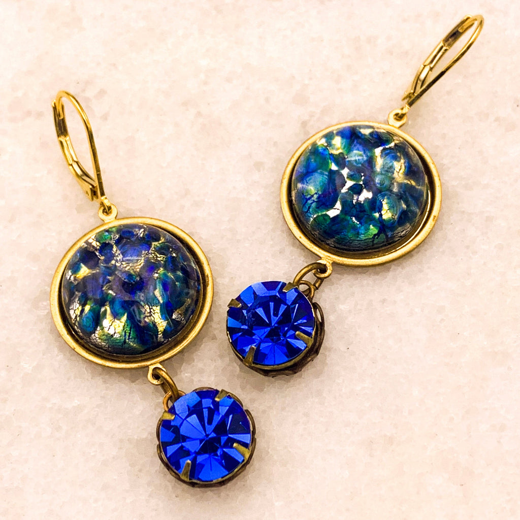 We love these Vintage 1950’s Opal Art Glass Flecked with Silver Cabochons and joined them with these exotic Vintage Sapphire Crystal.