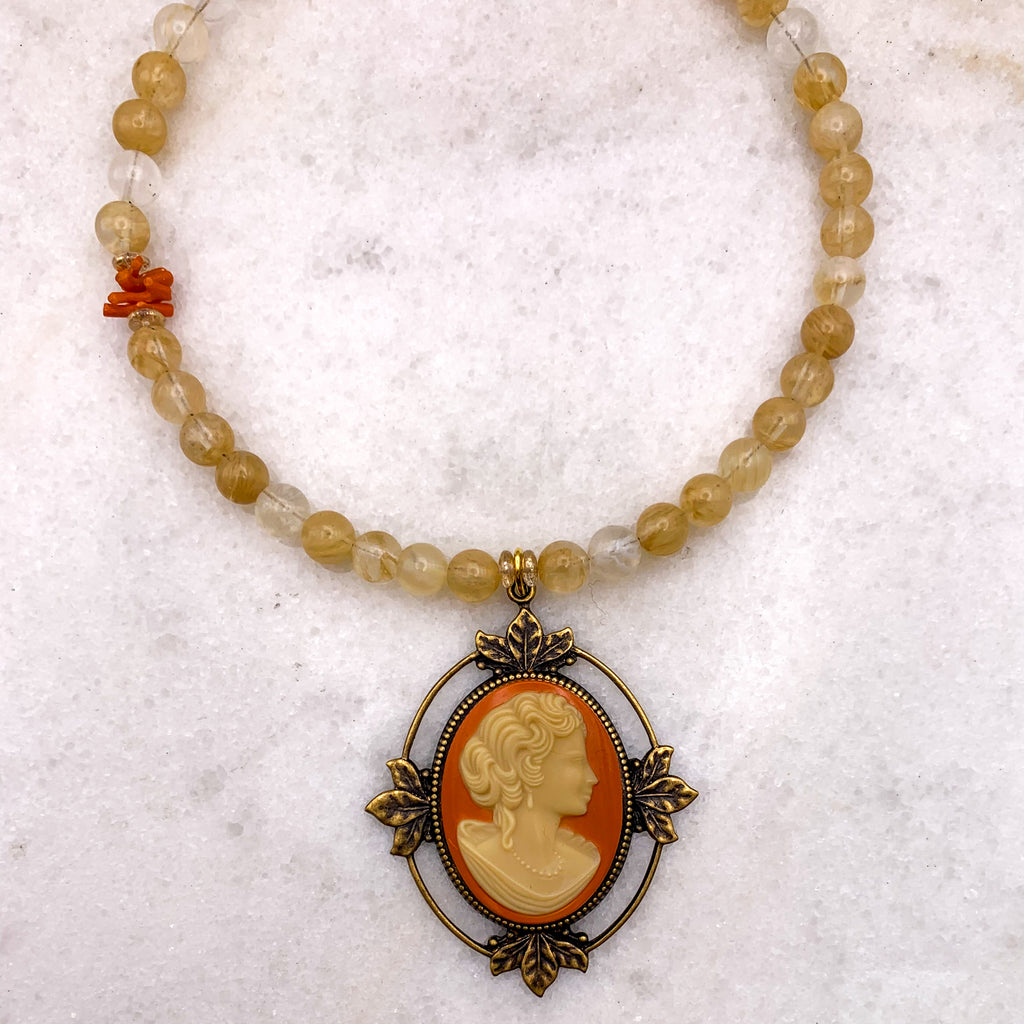 An Adorable Necklace of Vintage Carved Cameo in Classic Cameo and Cream in Old Gold Setting and hung with Yellow Onyx Carved Gemstone Beads and with Natural Coral.