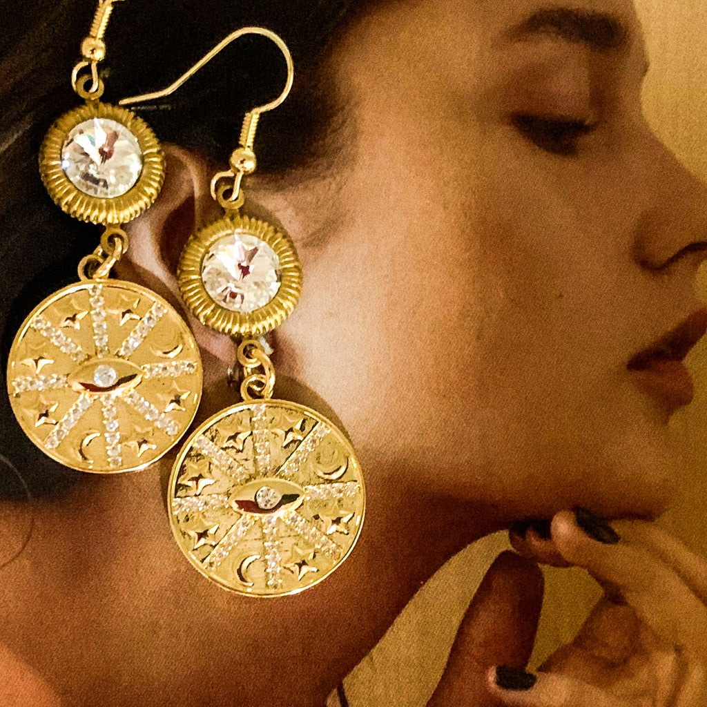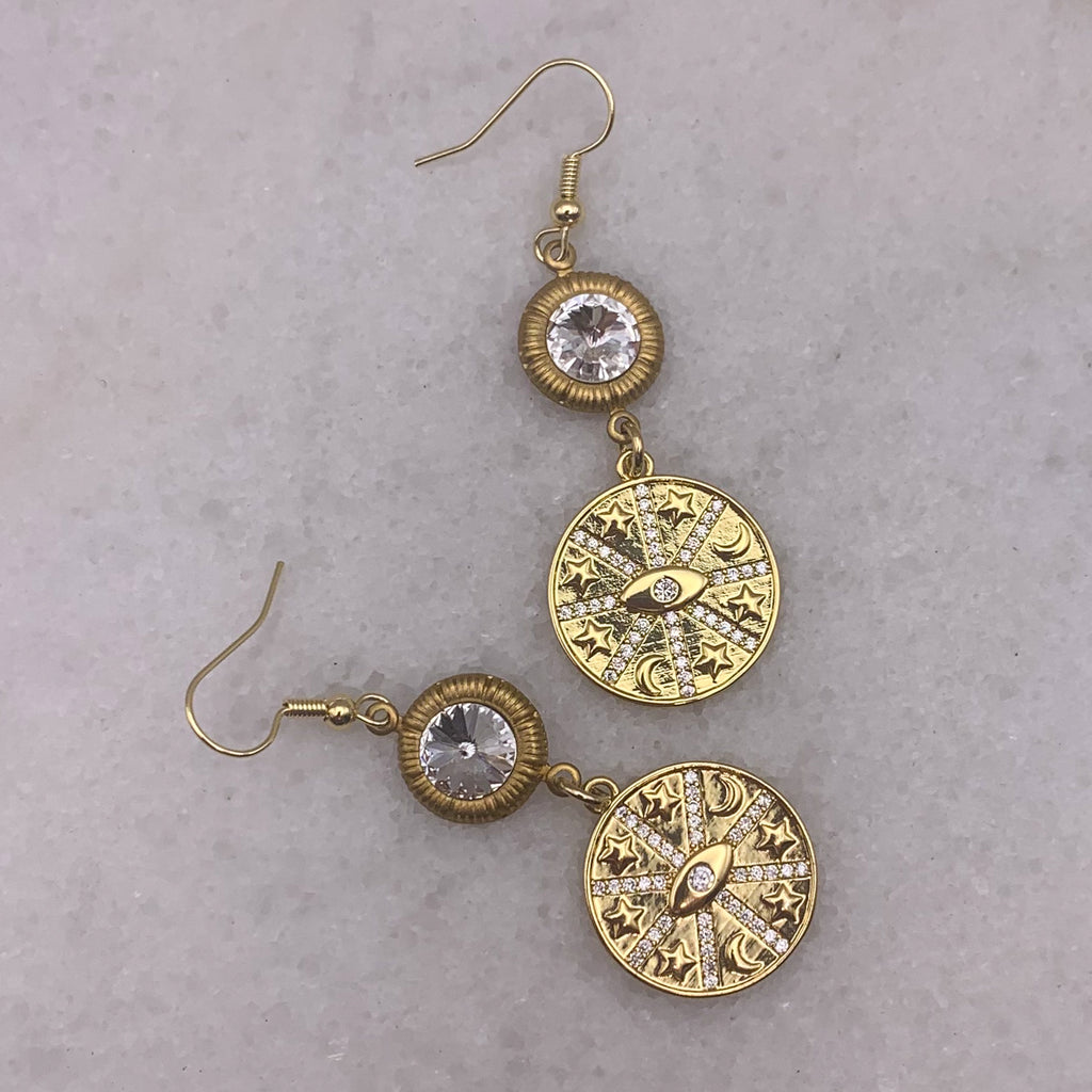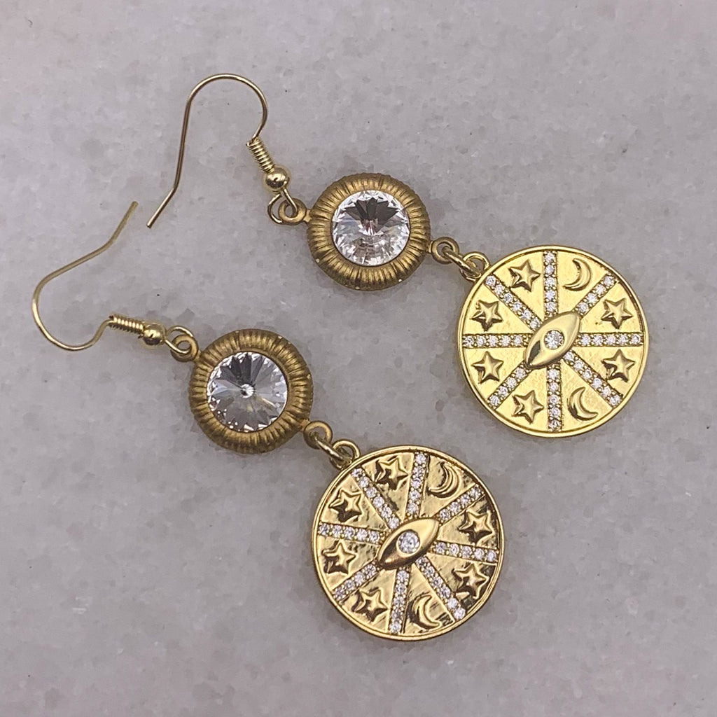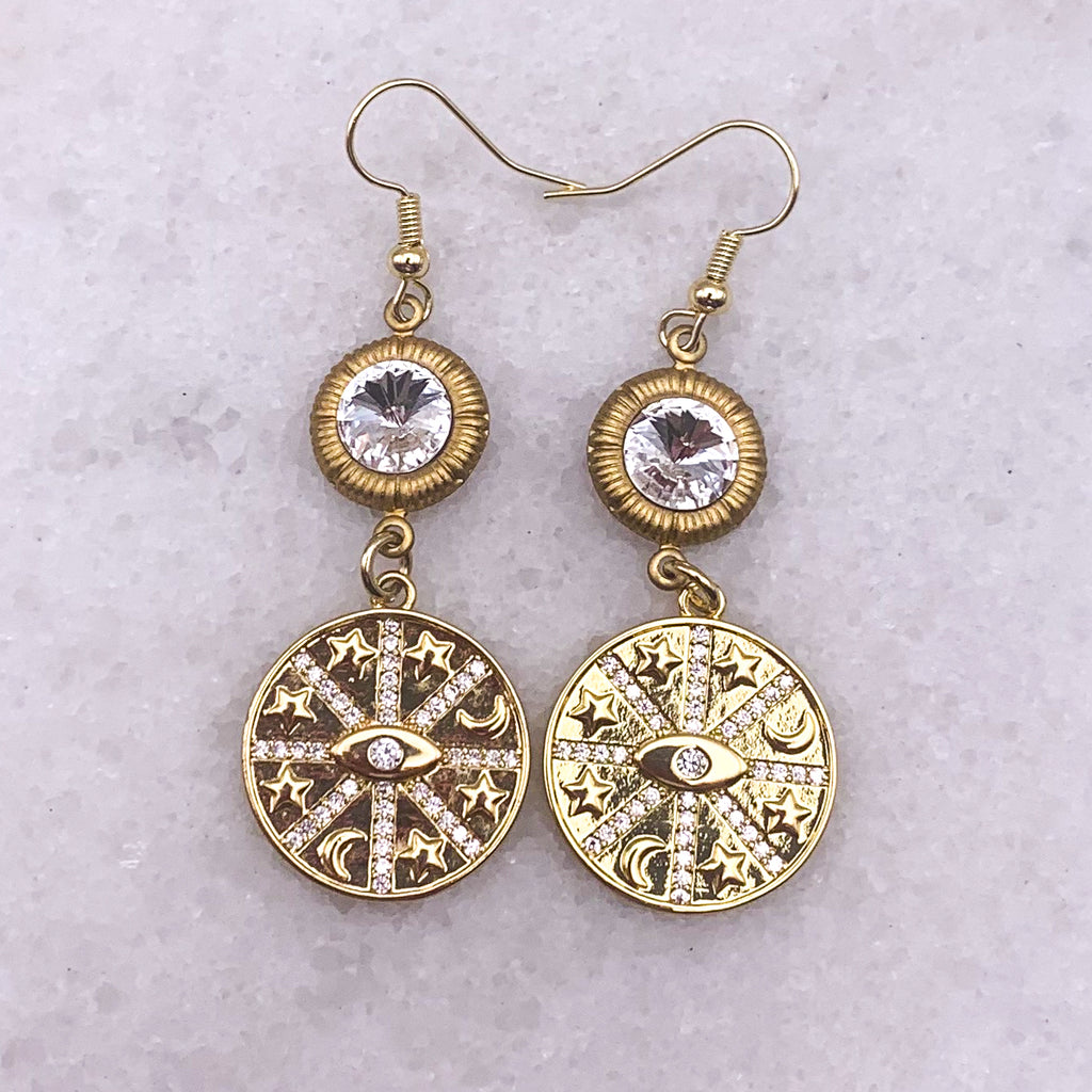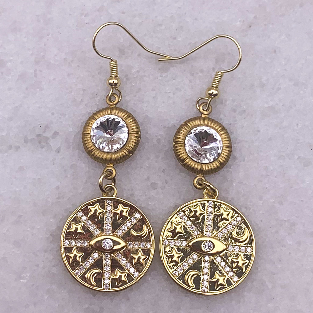 The inner eye of the gold-filled drop is surrounded with stars and crescent moons and topped with cut crystals.