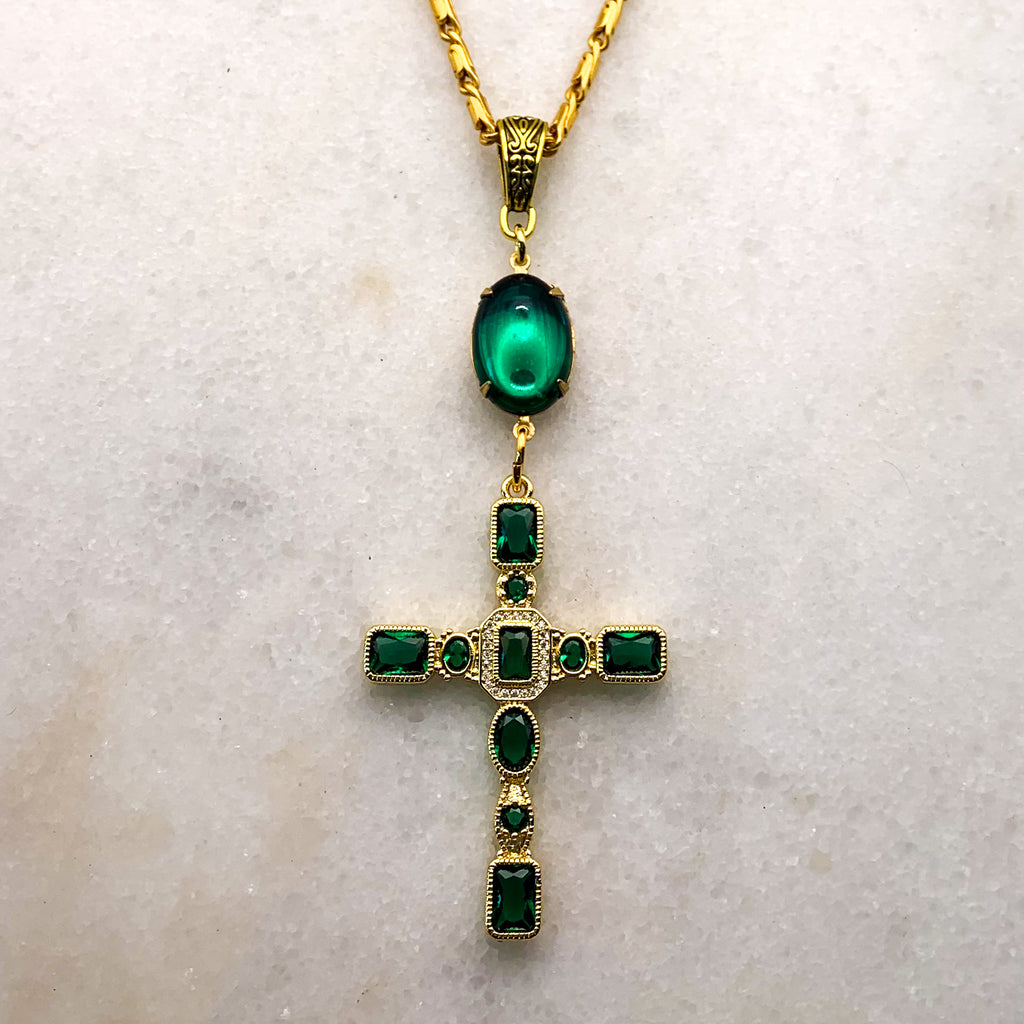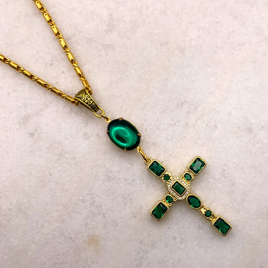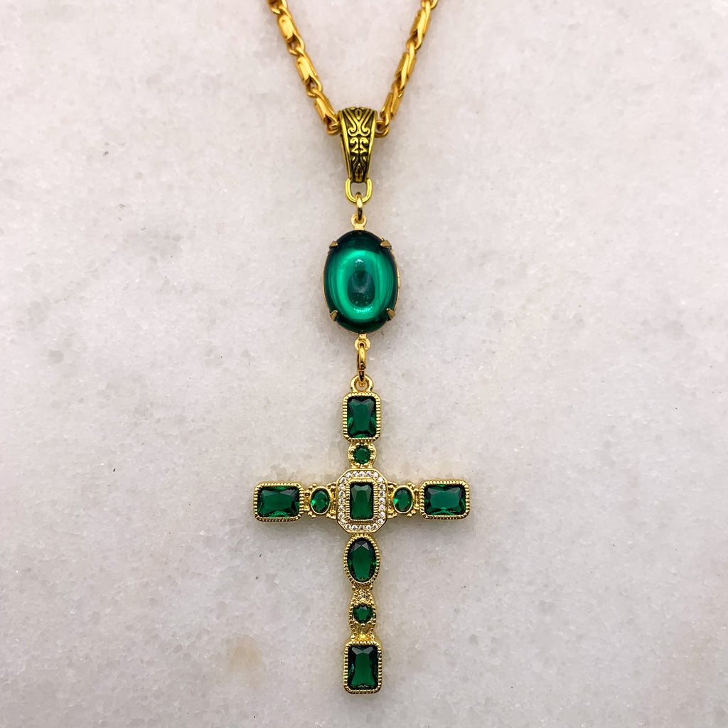A strikingly beautiful Necklace with a gorgeous Emerald filled cross 24 Carat Gold Filled.