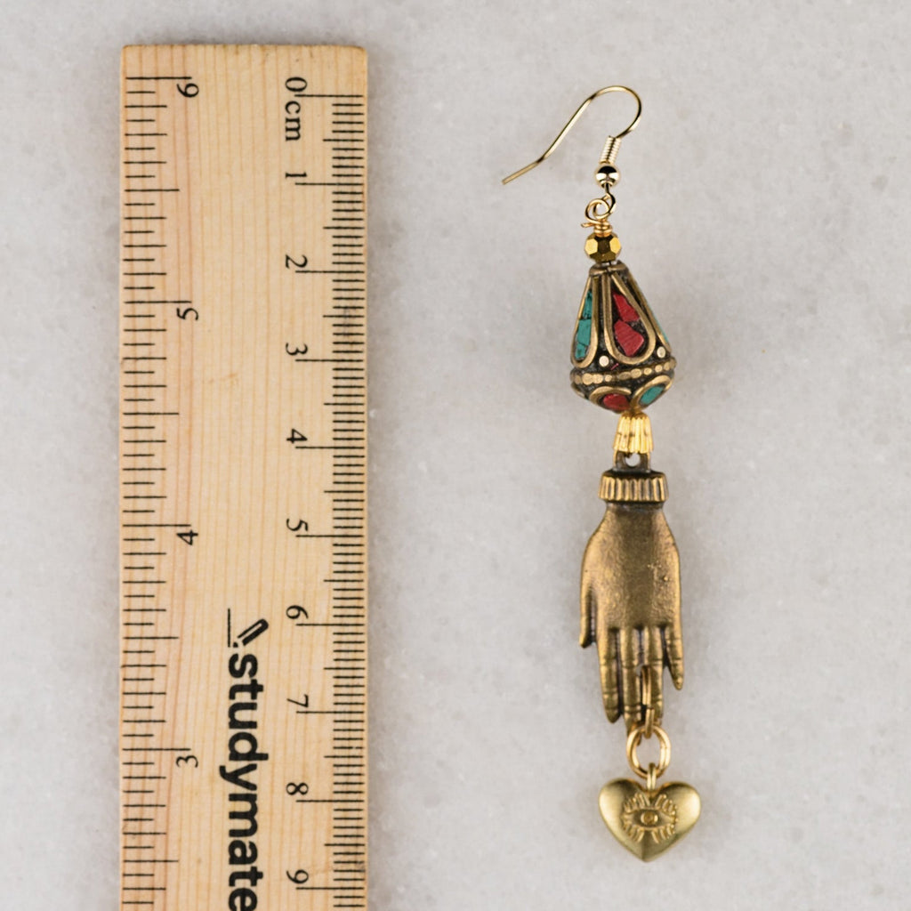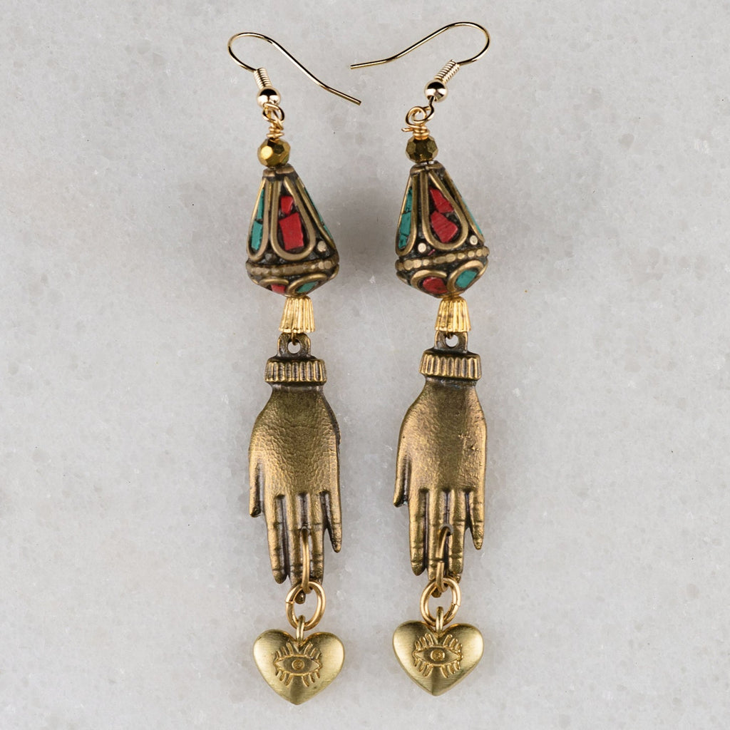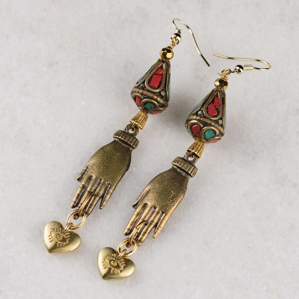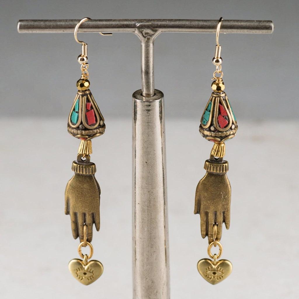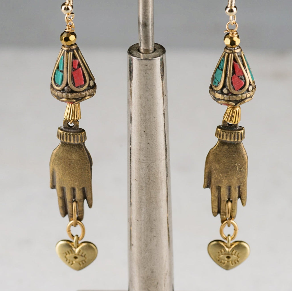 These delightful earrings, are made from beautiful vintage Tibetan Beads , a hand symbol and the stunning heart with eye symbol. All are meant as a blessing and expressive.