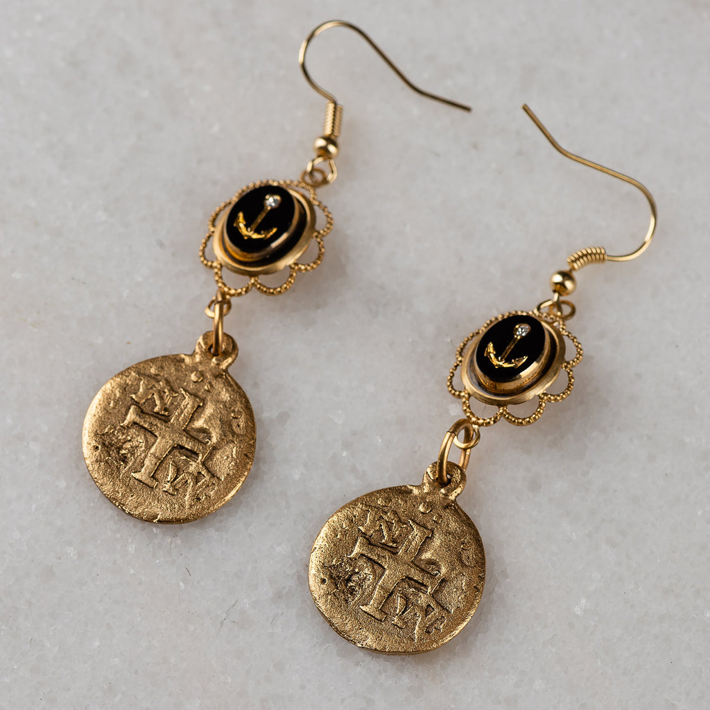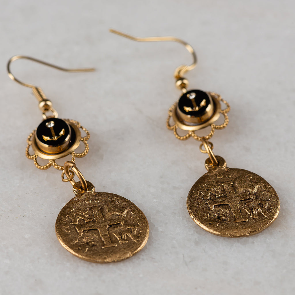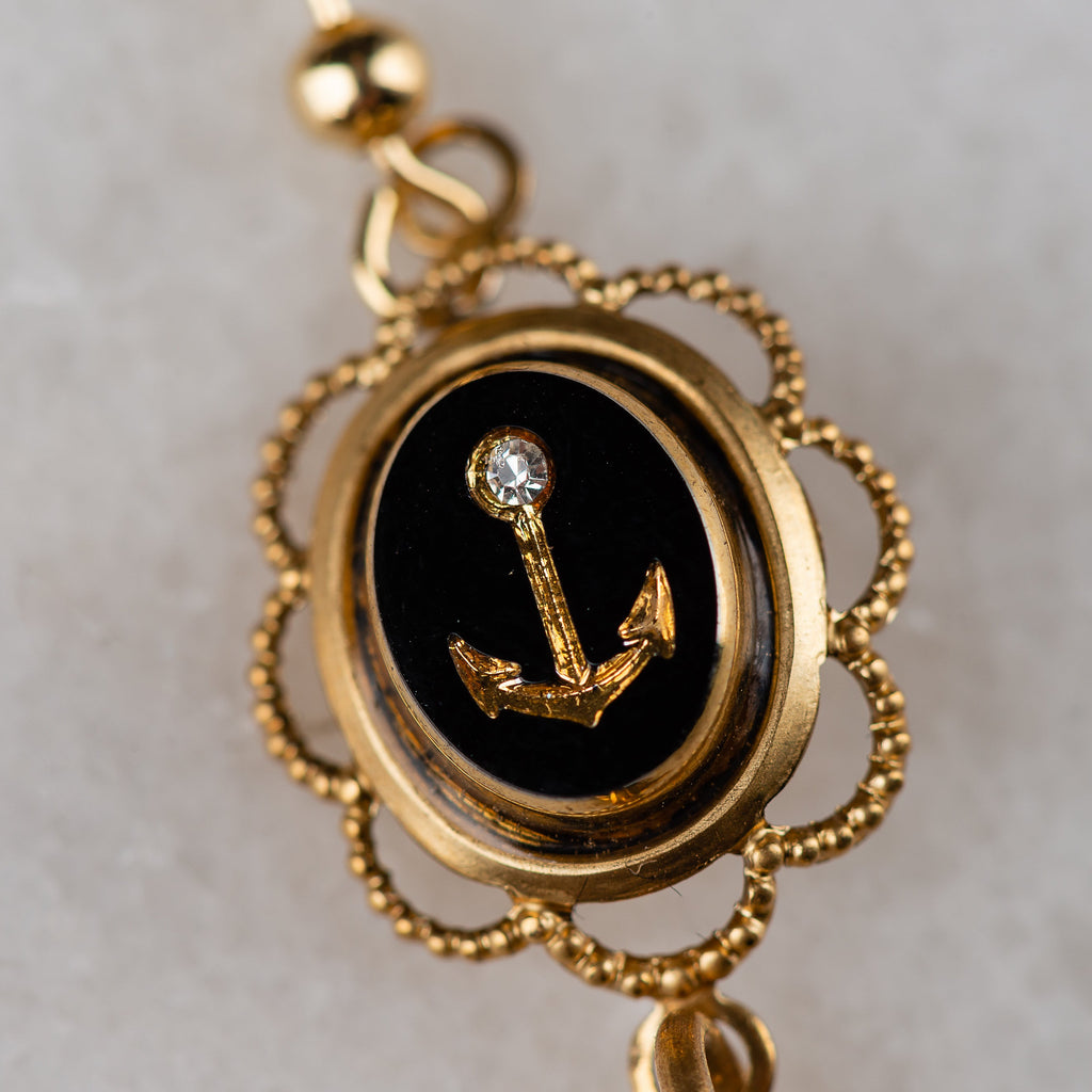 A Vintage Intaglio of Diamante Anchor with a Golden Medallion. 18 Carat Gold Plated ear post.