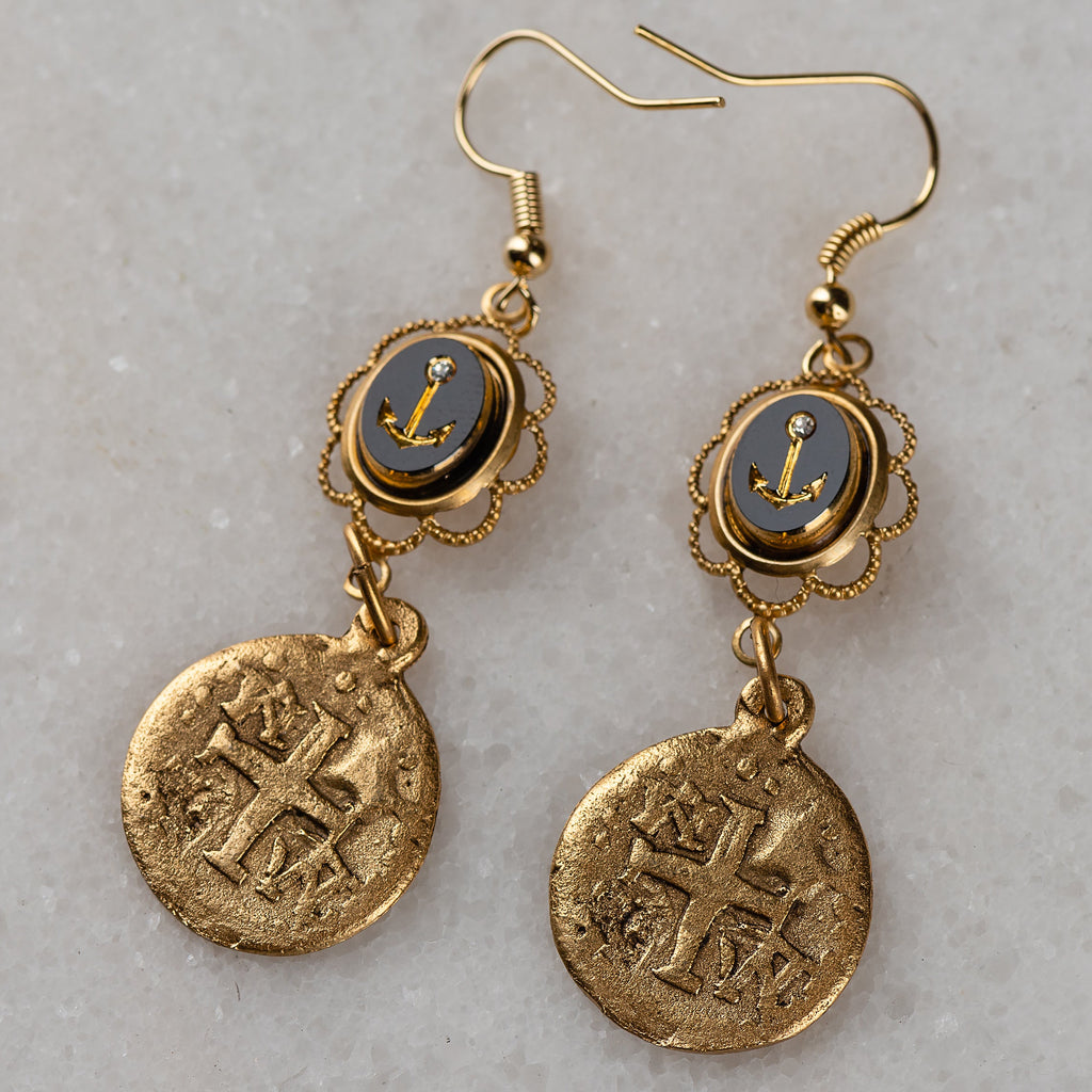 We mounted a stunning perfect tiny Vintage 1950's intaglio with hand gilded anchor and the sweetest teeny tiny diamante' onto a filigree base. Then hung a golden medallion that looks like it came out of a pirates treasure, or the crusades, but is actually a 1950's reproduction.