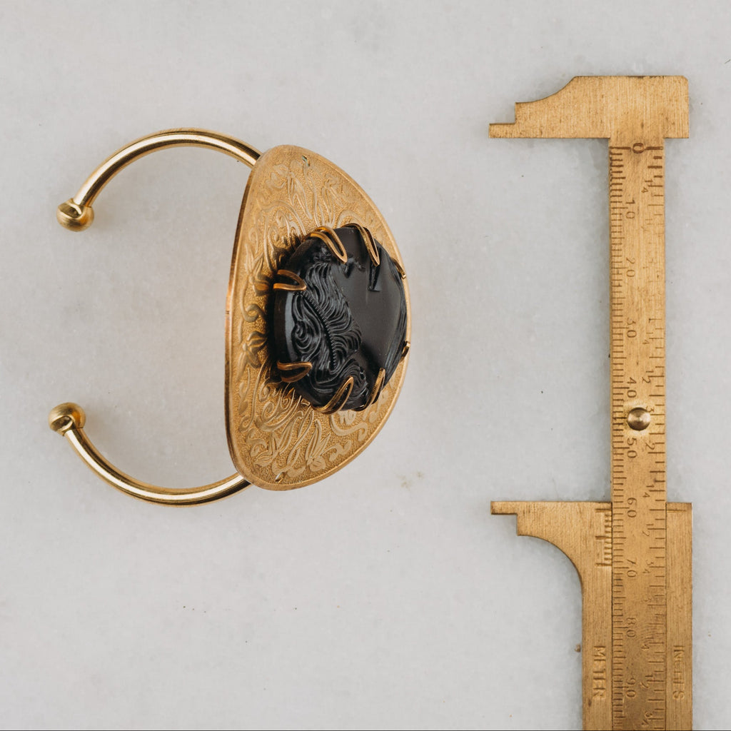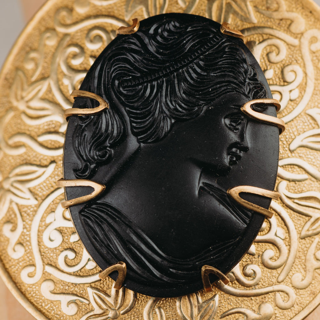 Wonderful Vintage French Jet Cameo was mounted on a lovely Copper Orb and set on a light golden bracelet.