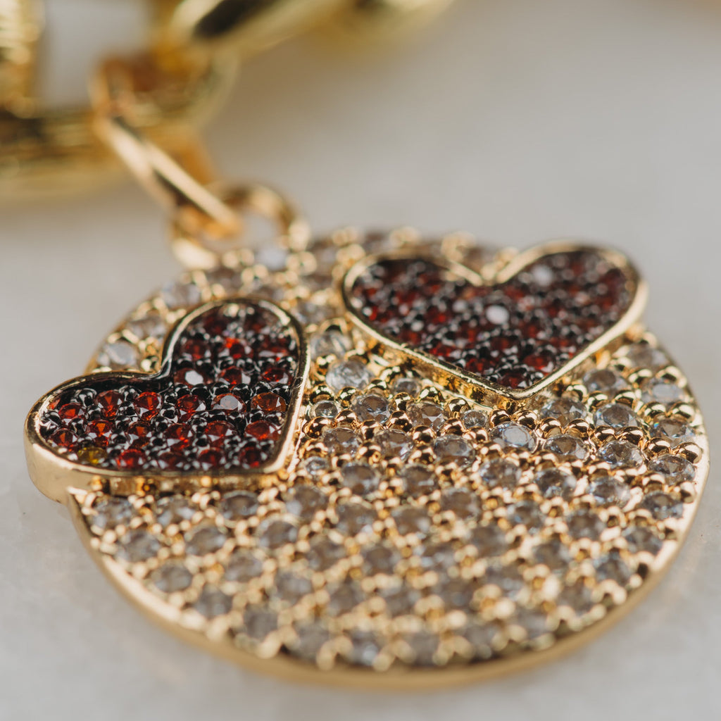 A Stunning Vintage Bracelet is hung with a 18 Carat Gold Heart Face Diamante Charm, with Tiny Lock and Smiley Face 18 Carat Gold Charms. A fabulous Vintage 1970’s Chain.
