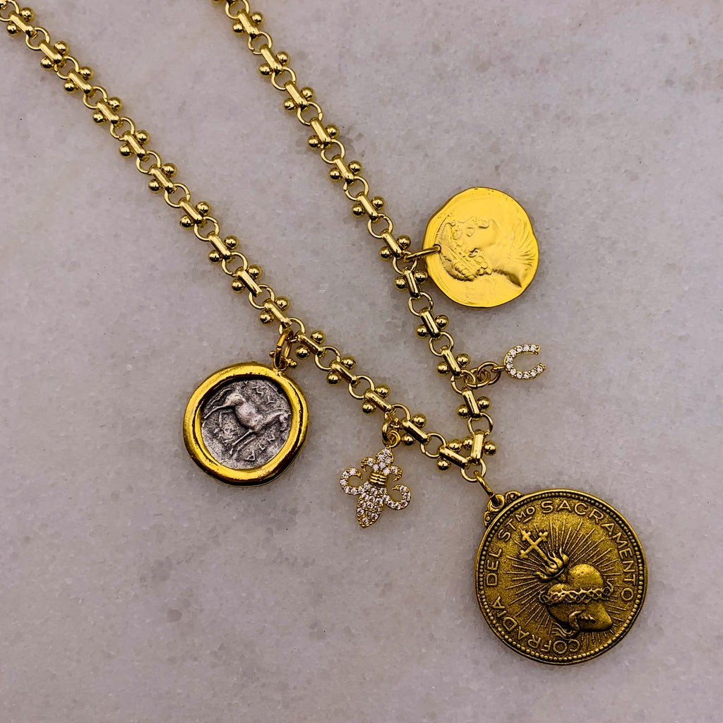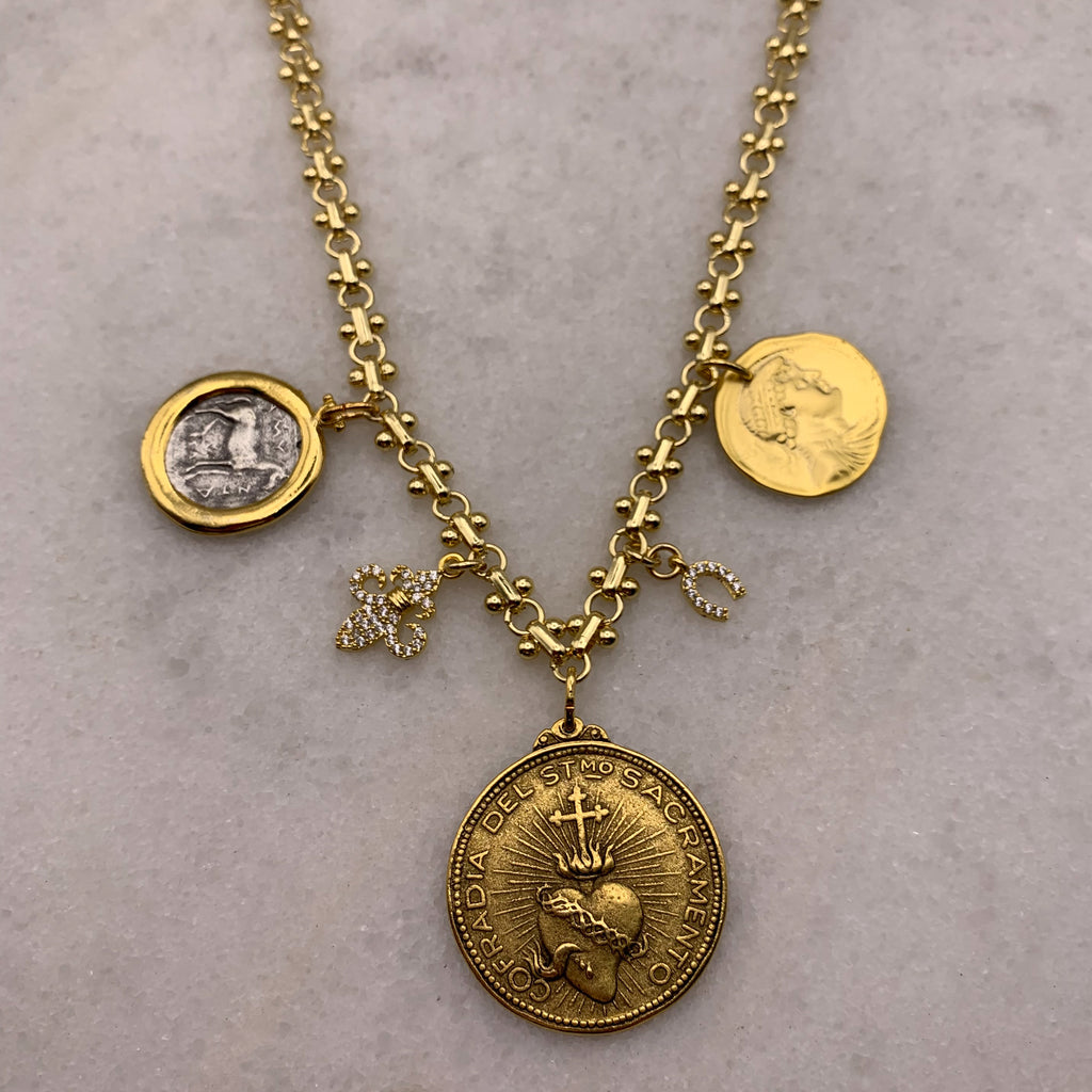 Gold-Filled Rare Vintage Medallion of Sacred Heart with Vintage Gold-Filled Greek Coin and Silver and Gold Medallion of Ancient Horse mixed with Crystal Fleur de Lis and Lucky Horse-Shoe.