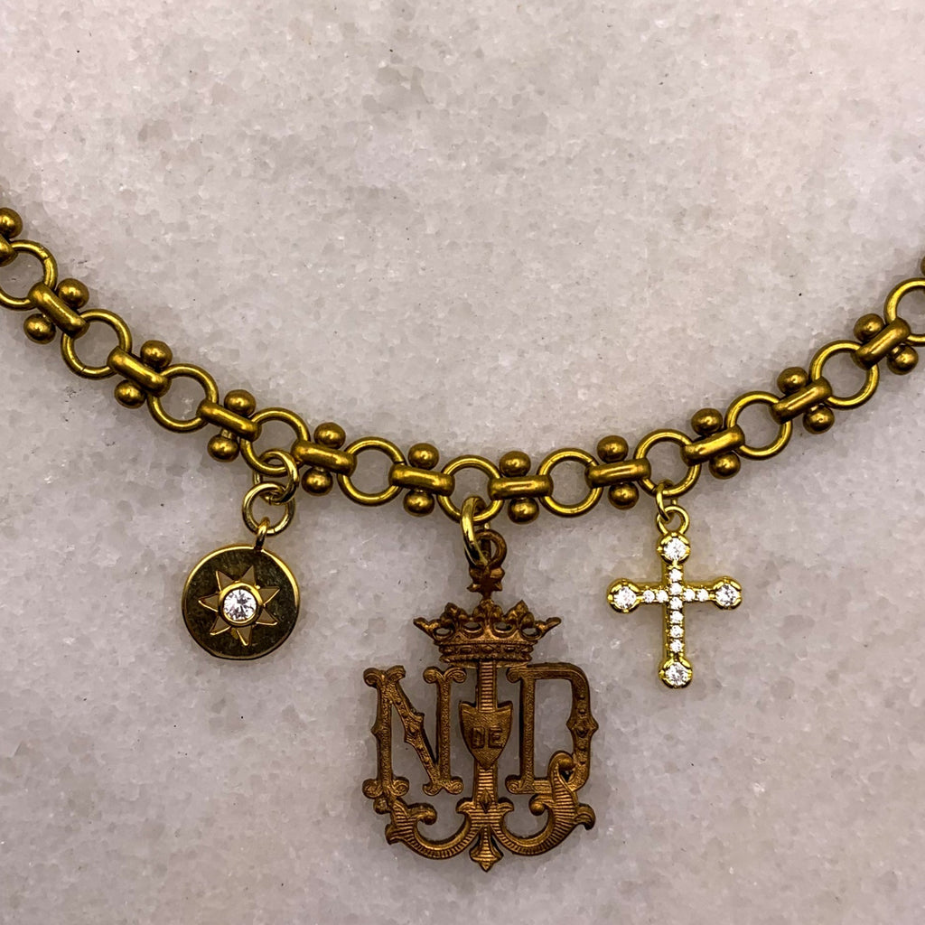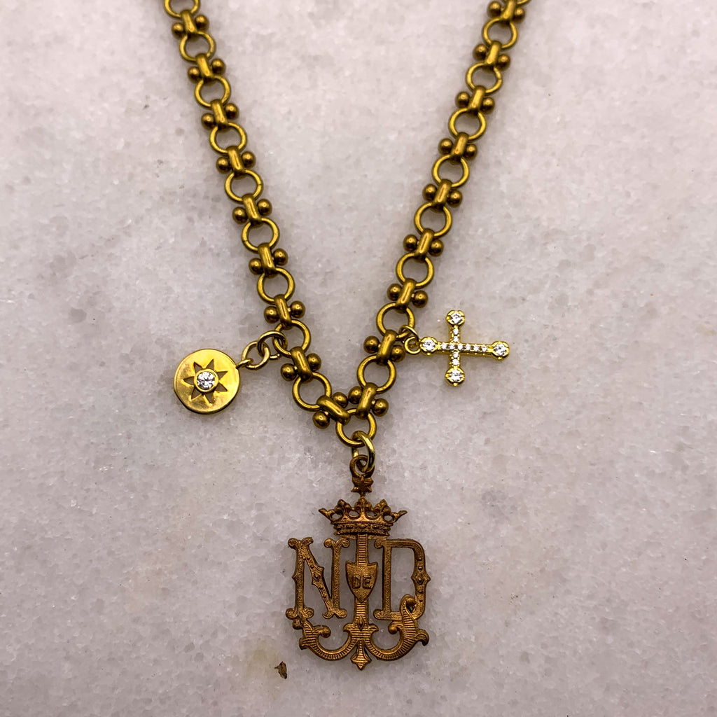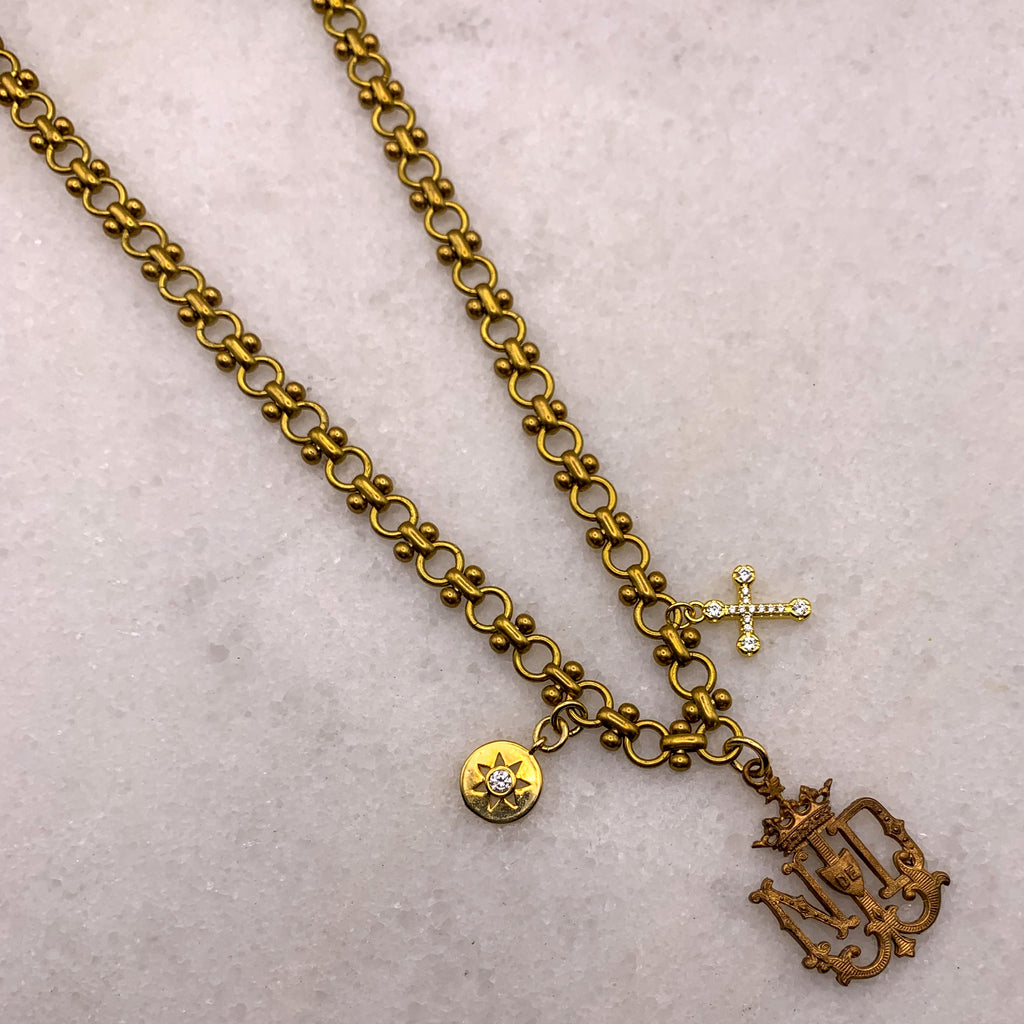 The Rare Medallion of this Necklace is a Vintage Carved Piece, from the early 19th Century. It is surrounded with an 18 Carat Gold Filled Cross and Wonderful Sun Charm. It was Louis XIV who was considered the Sun King of France.