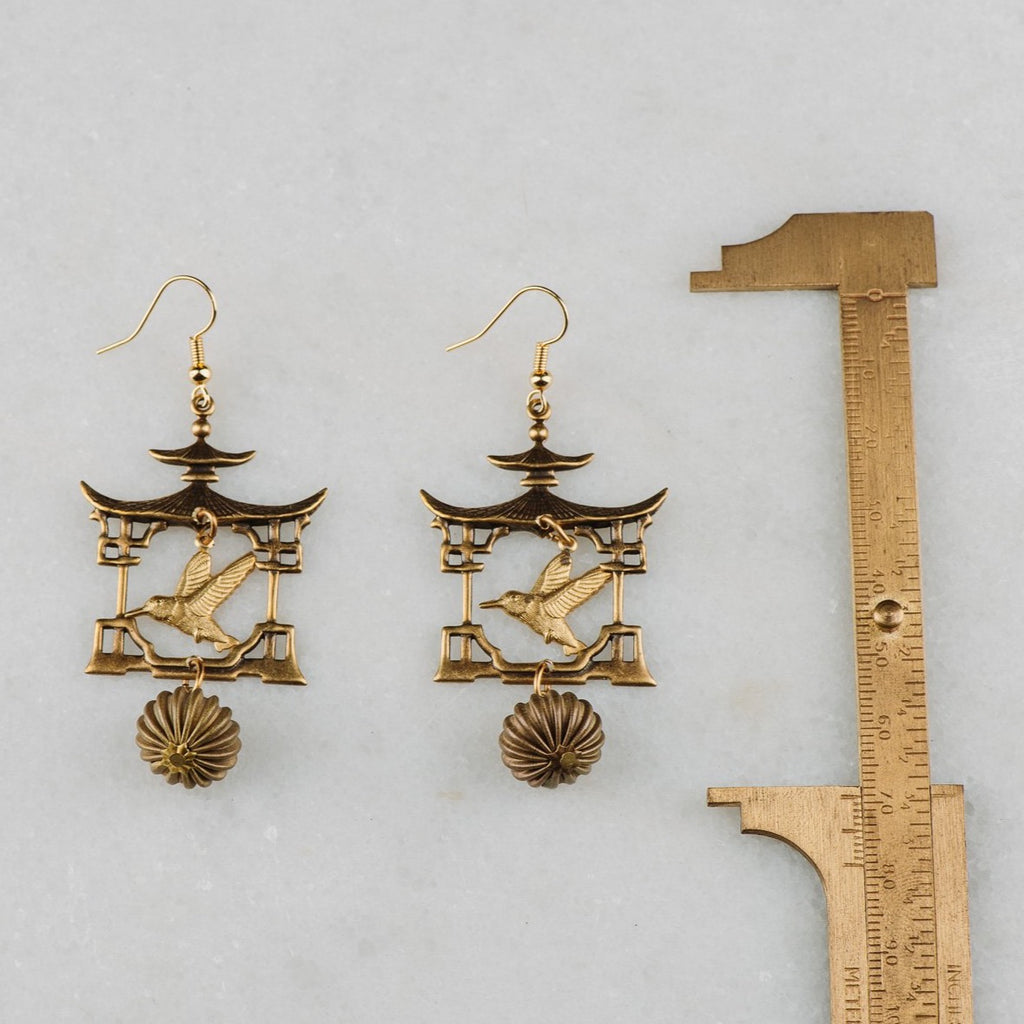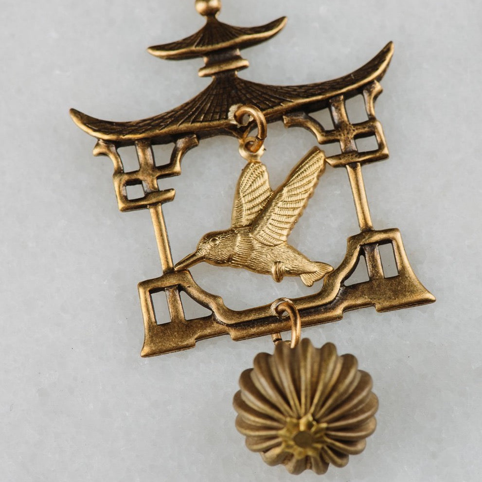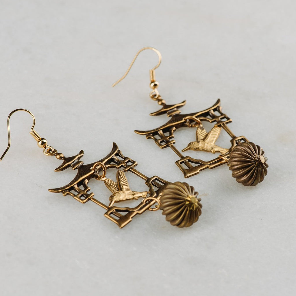 The Bohemian attitude is truly on the rise in these limited edition hand made in Australia earrings. A vintage Chinese pagoda in golden bronze is adorned with a sweet vintage bird and vintage golden drop. The Ear wire is 18 carat Gold plated.