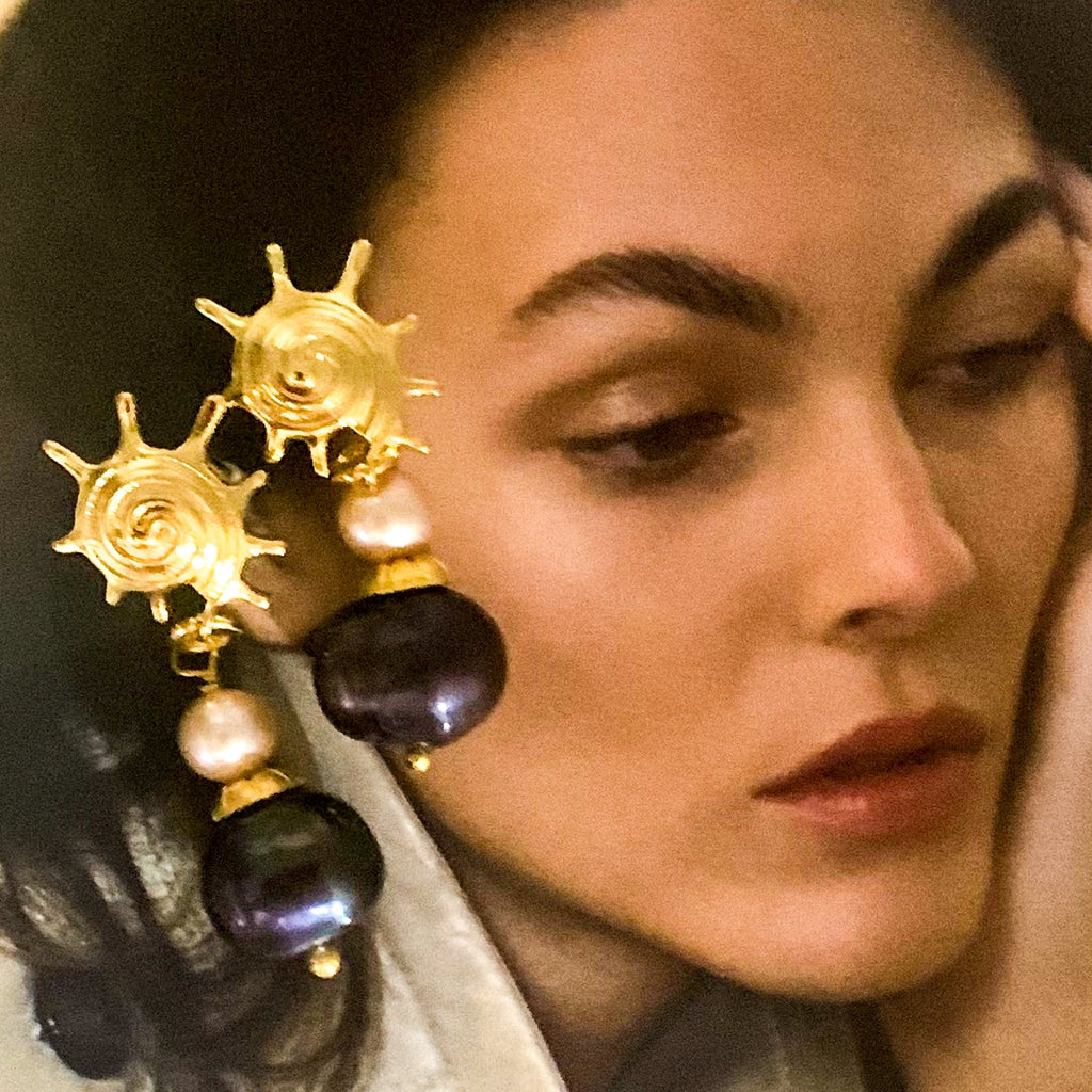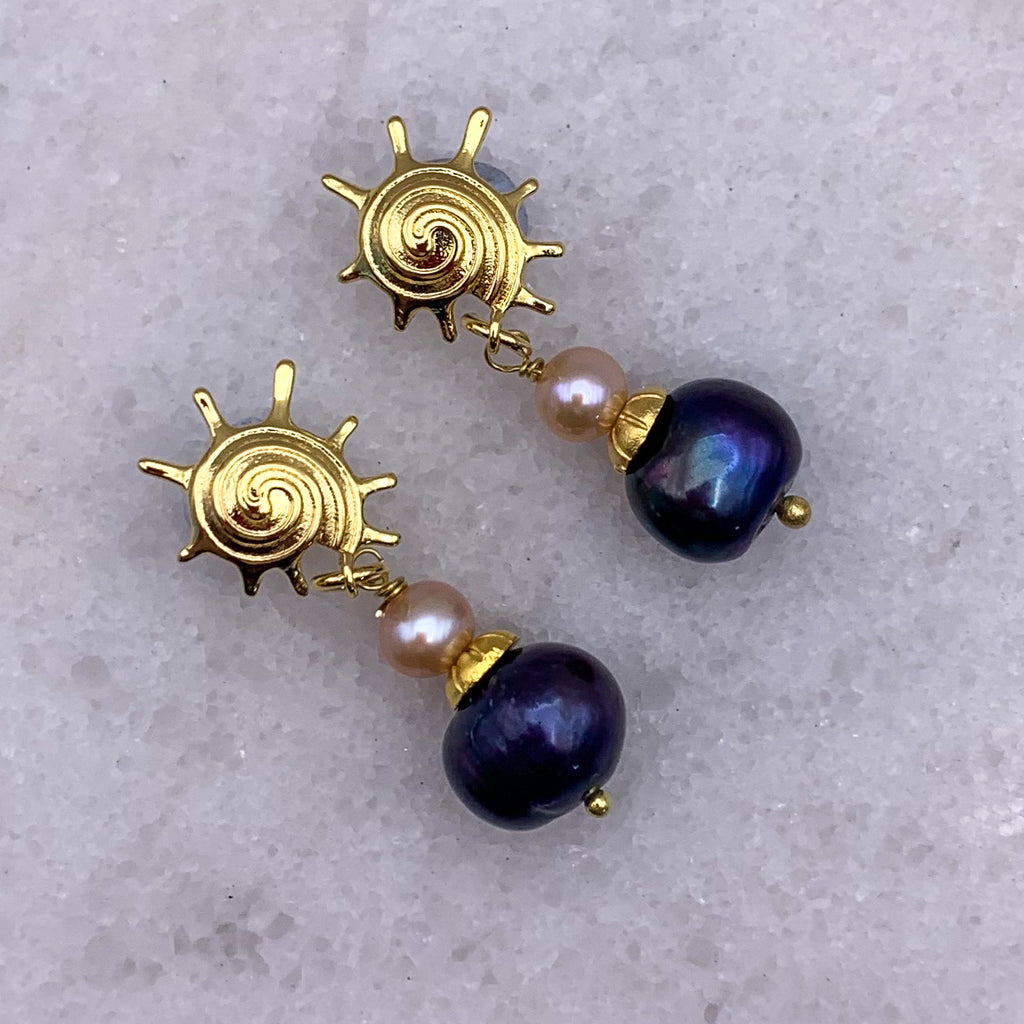 A wonderful carved Gold-Filled carved shell with gold ear stud hangs perfectly to set these pearls off beautifully.