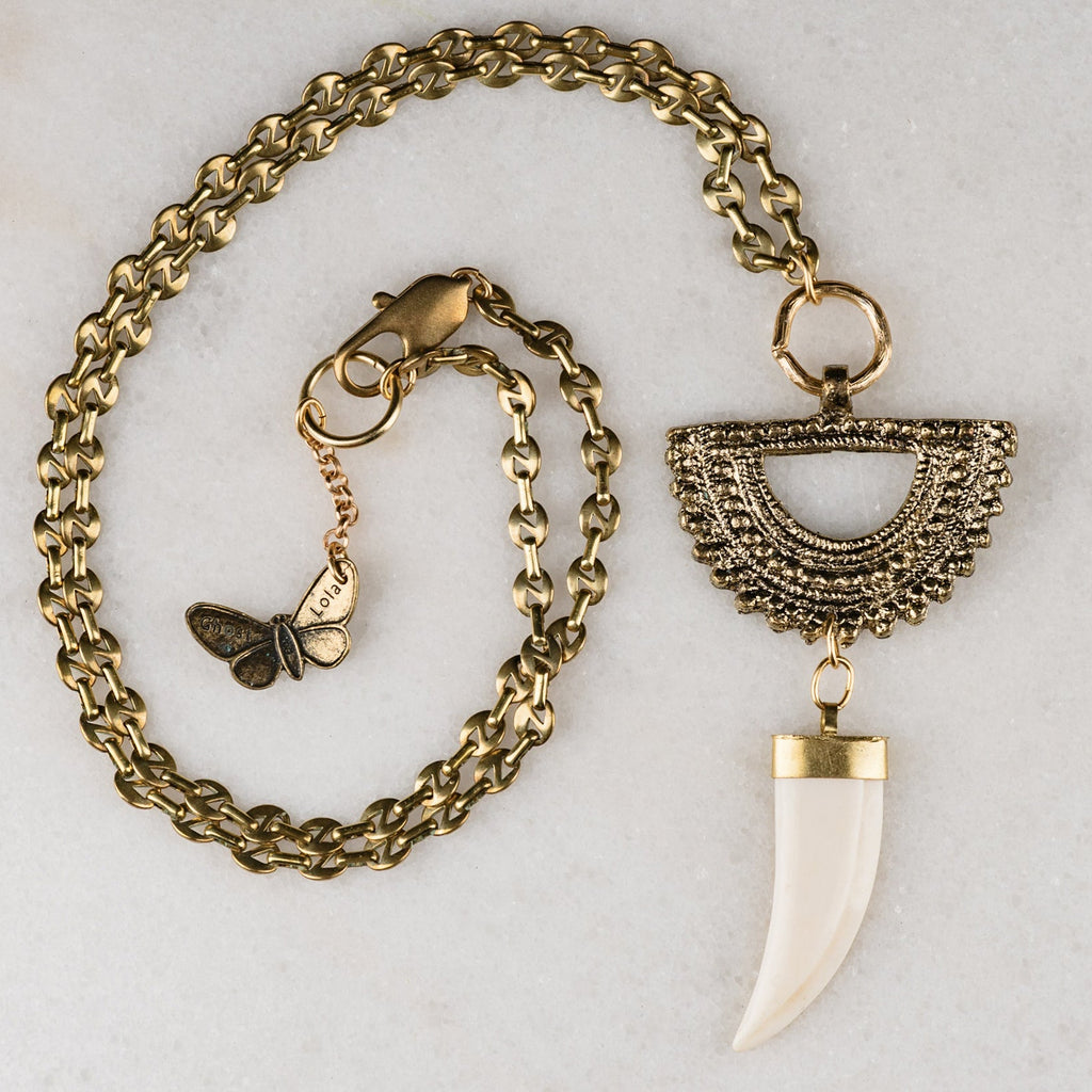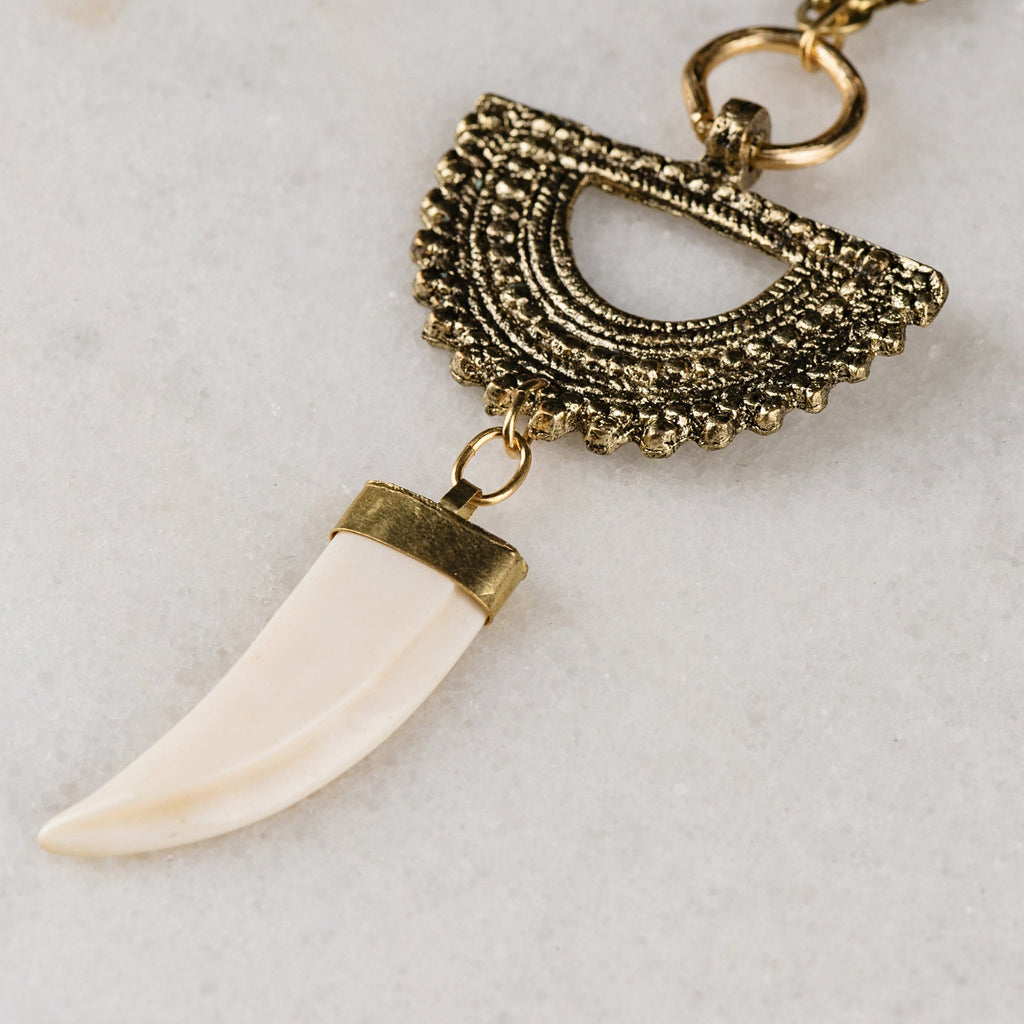 The vintage Gucci chain is hung with an ornate golden arch and then hung with a beautiful hand sculpted bone horn pendant.